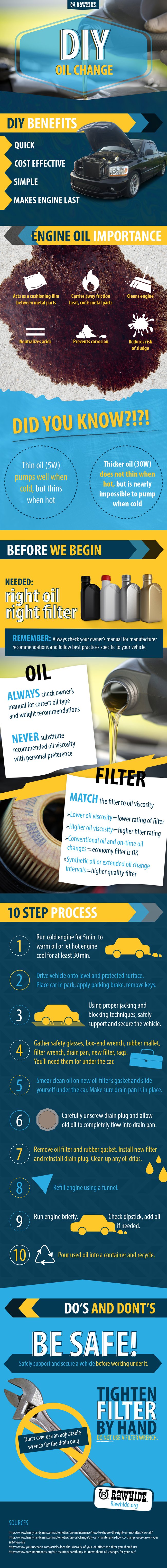 There are some guidelines to follow before beginning an oil change. A cold car engine should be run for 5 minutes or so to warm the oil. A hot car engine should be cooled for at least 30 minutes. Remember safety first when performing a DIY oil change. Drive the vehicle onto a level and protected surface. Place the car in park, apply the parking brake, and remove the keys. Using proper jacking and blocking techniques, safely support and secure the vehicle. After this crucial step is checked off the list, you are ready to begin.